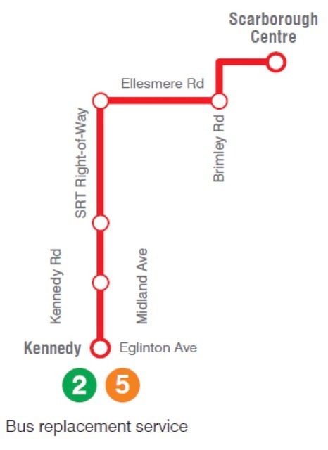 Following the route of the old Scarborough RT, the busway will connect Kennedy Station to Ellesmere Station with a dedicated express bus route and then run on priority lanes on Ellesmere to Scarborough Centre Station Bus Terminal. There will be stops at Tara Rd, Lawrence Ave E, and Ellesmere Rd.