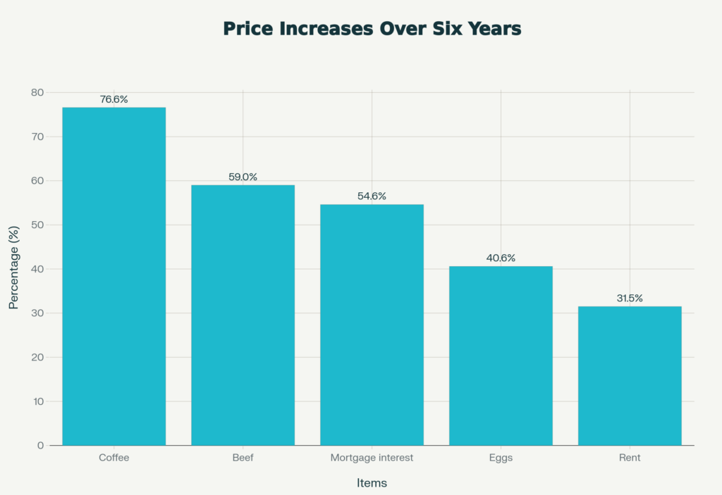 Coffee is up 76.6 percent over six years, beef 59 percent, mortgage interest 54.6 percent, eggs 40.6 percent, rent 31.5 percent.